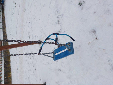 Popis: poškozená houpačka na dětském hřišti Seifertova x Heydukova